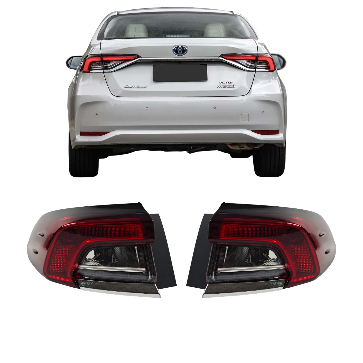 Par de lanternas traseiras desenvolvido para reposição exclusivamente no lado do canto do Toyota Corolla 2020 em diante. Produto com lente lisa em acrílico e carcaça em ABS automotivo, mantendo o visual e a sinalização traseira originais do veículo. Este modelo não é FULL LED, porém acompanha lâmpada LED somente para a função de STOP de freio, além de chicote. A luz de ré fica na lanterna do porta-malas, vendida separadamente.