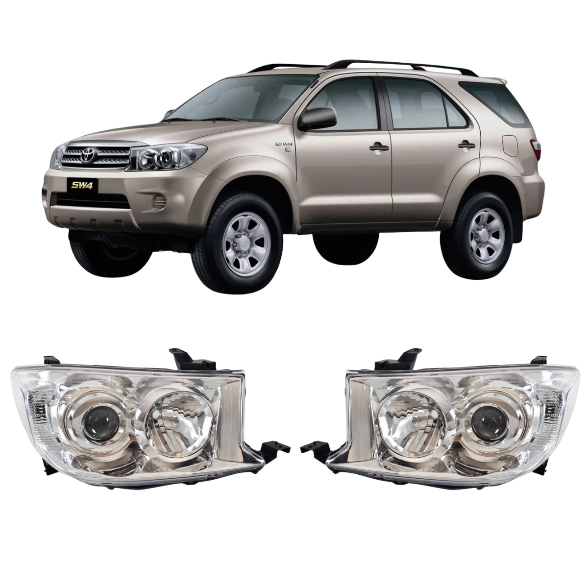 Produto: PAR DE FARÓIS DIANTEIROS HALÓGENOS MÁSCARA CROMADA VO6 – TOYOTA HILUX SW4 2008 A 2011 (FOCO DUPLO)